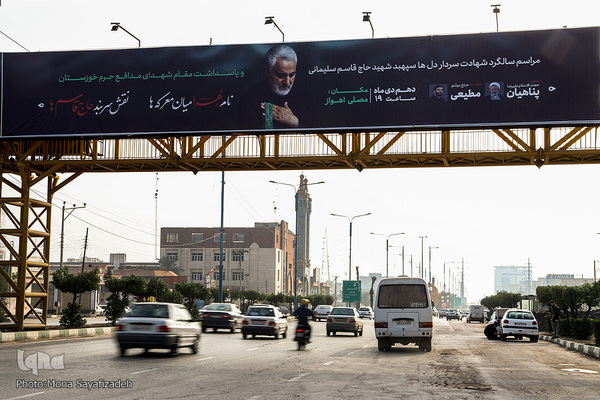 در دومین سالگرد شهادت سپهبد شهید حاج قاسم سلیمانی شهر اهواز رخت عزا بر تن کرده و المان شهری به یاد این شهید والامقام تغییر چهره داده است.