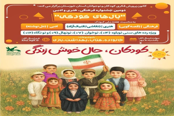 دومین جشنواره فرهنگی، هنری و ادبی «بال‌های کودکی» در خوزستانبه گزارش ایکنا از خوزستان، کانون پرورش فکری کودکان و نوجوانان استان خوزستان، فراخوان جشنواره فرهنگی، هنری و ادبی «بال‌های کودکی» را به‌مناسبت هفته ملی کودک منتشر کرد.
