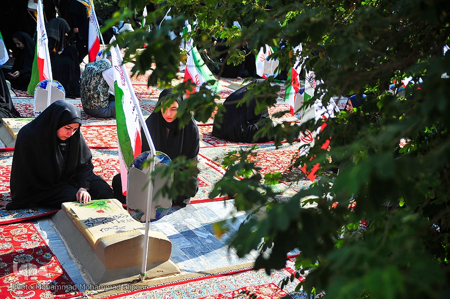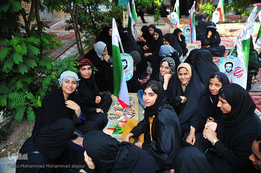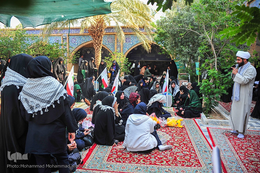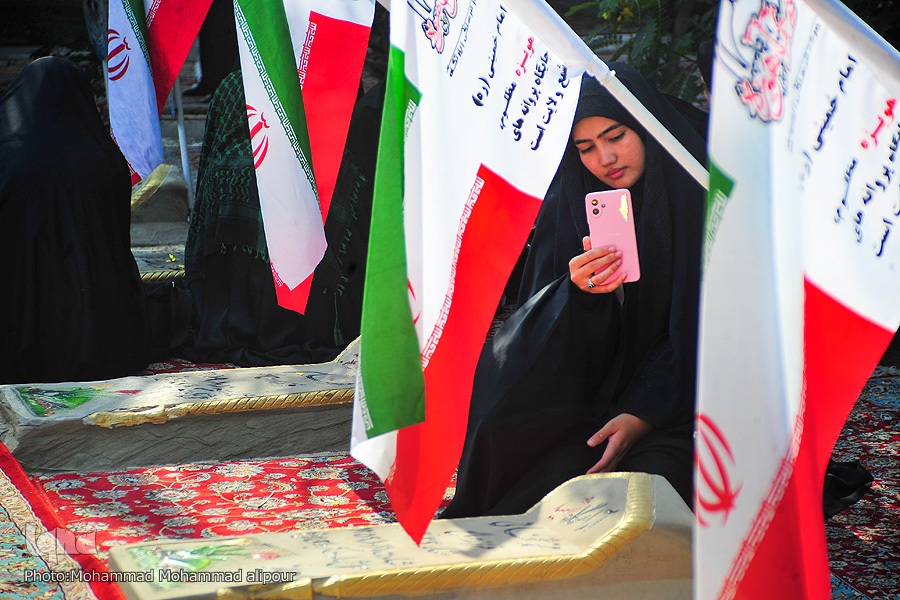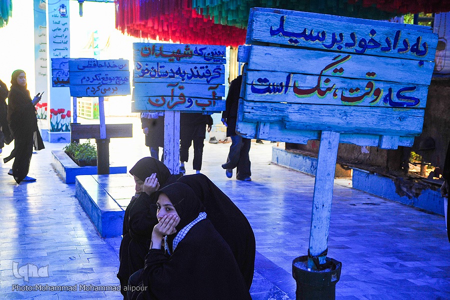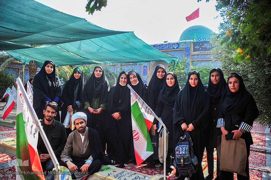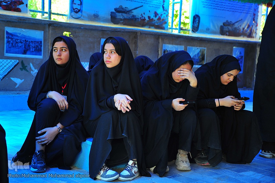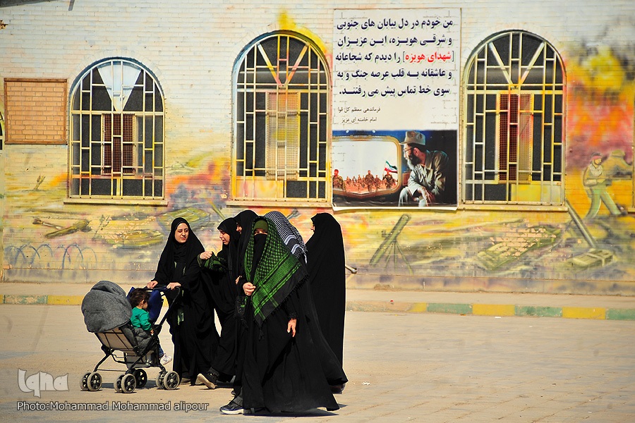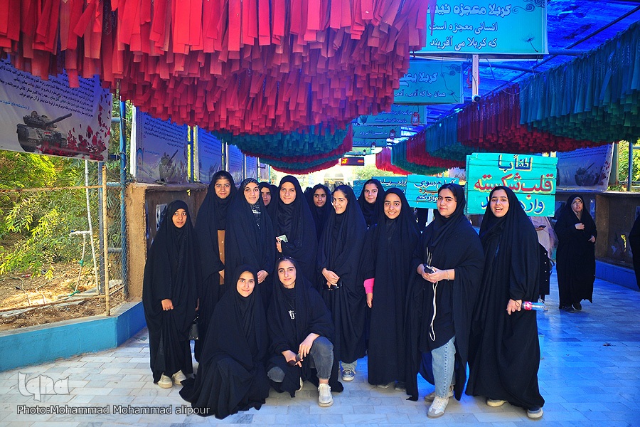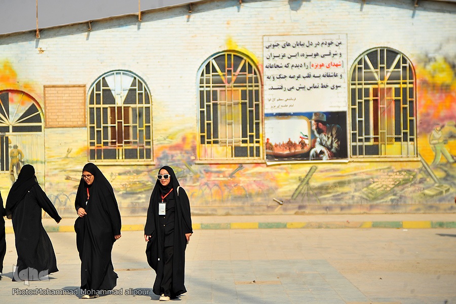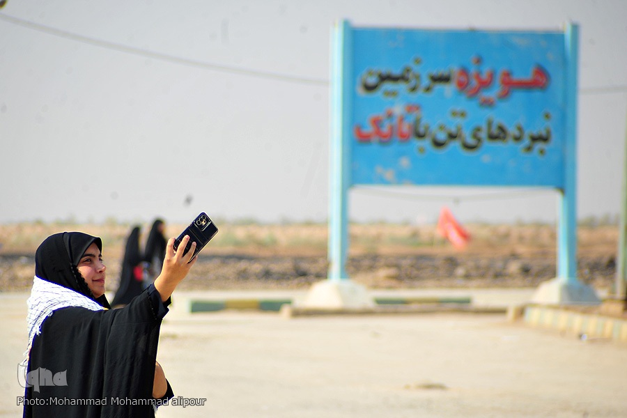 اینجا یادمان شهدای هویزه است، دانش‌آموزان دختر از شوشتر و تهران و یزد و کرمان و نقاط دیگر کشور آمده‌اند؛ جمعی از آن‌ها گعده گرفته و برخی دیگر در دالان ورودی یادمان که حال و هوای معنوی خوبی دارد و از سقف آن صدها پیشانی‌بند آویزان شده است نشسته‌اند؛ برخی بر مزار شهیدی که اصلا او را نمی‌شناسند، نشسته و در حال و هوای خود هستند و اشک می‌ریزند. یادمان شلوغ شده است ولی پر است از خلوت‌های عاشقانه.